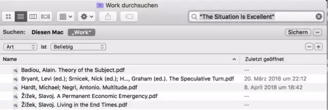 有时间的话,肯定应该到处查一查,这也是当今的技术条件为我们提供的便利(突如其来的正能量:不要辜负这个时代……)。除了常用的Google Scholar/Books、各种哲学百科和哲学辞典之外,还有一个相对少见的技巧:在自己收藏的电子书中检索,因为最近十几年的Windows和Mac系统都能够对pdf等格式的文件进行全文检索。例如在我自己的电子书里搜索“形势大好”,可以得到如下结果: