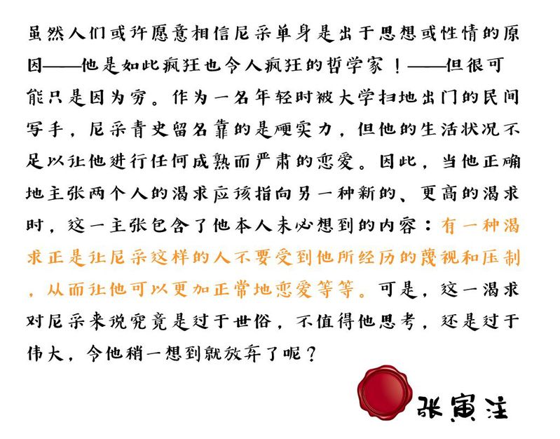 尼采给爱情下了定义,他认为这是唯一值得哲学家来下的定义。“爱情之法就是战争,基础就是两性之间不共戴天的仇恨。”他感叹,“唉,那只是一对灵魂的贫乏罢了!……你们的结婚终结了许多短促的疯狂,而代以一个长期的愚蠢。”