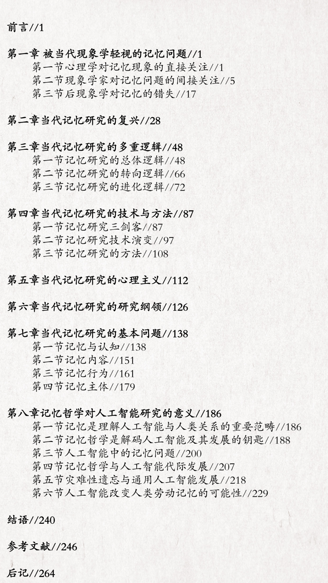 本著作即是如此,试图通过对20世纪60年代以来的记忆科学研究成果进行哲学阐释,继而实现两个密切相关的目的,其一是为当代记忆哲学复兴提供科学路径的支持其二是为若干哲学问题的解决提供记忆方案。其中,科学路径与哲学路径形成了两条共同的有益于记忆哲学复兴和发展的路径。甚至深入分析科学路径反而更加有助于这一任务的实现。因此,本著作概括1960年代以来记忆研究的整体状况、多重逻辑、技术方法、研究纲领,并进一步分析了记忆研究中的基本问题,并在此基础上反思记忆研究对于理解人工智能发展的诸多意义。