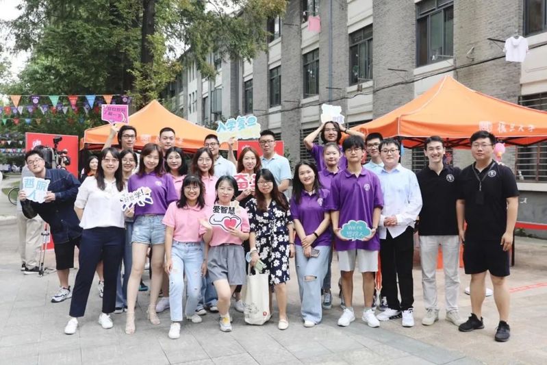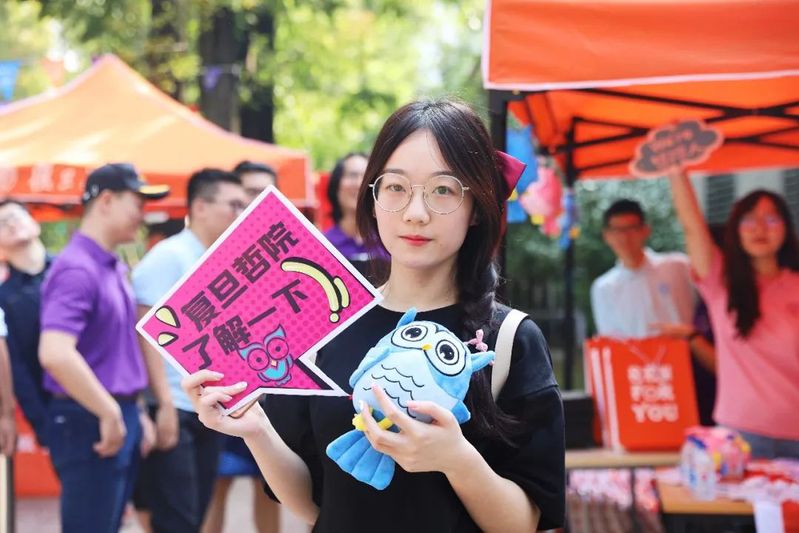 哲学学院2020级本科新生正举着学院特色趣味kt板留下自己在复旦的第一张照片