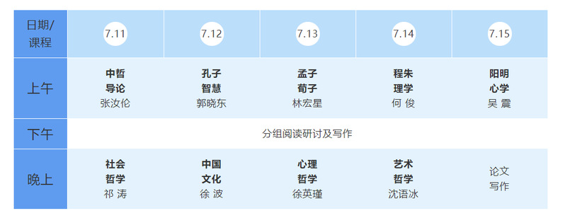 中国文化博大精深,源远流长,其中儒家哲学在中国文化中占据主要地位。理解儒家思想,对于把握中国传统文化,提升中学生的人文素养具有重要的作用。本届复旦中学生暑期哲学课堂以“为学与成人——儒家哲学智慧探秘”为主题,带领中学生对作为中国传统文化之核心的儒家哲学进行系统的探究。复旦大学哲学学院张汝伦、郭晓东、林宏星、何俊、吴震五位教授将为中学生带来五场精彩的主题讲座。