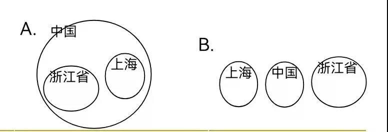 比如说,“上海”“中国”“浙江省”三个概念之间的关系,如果不从逻辑学的角度来说,很多人会认为“中国”真包含“上海”和“浙江省”。但事实上,这是行政区划和地理空间上的含义(A)。如果从概念的外延来看,它们三者之间关系是全异关系(B)。