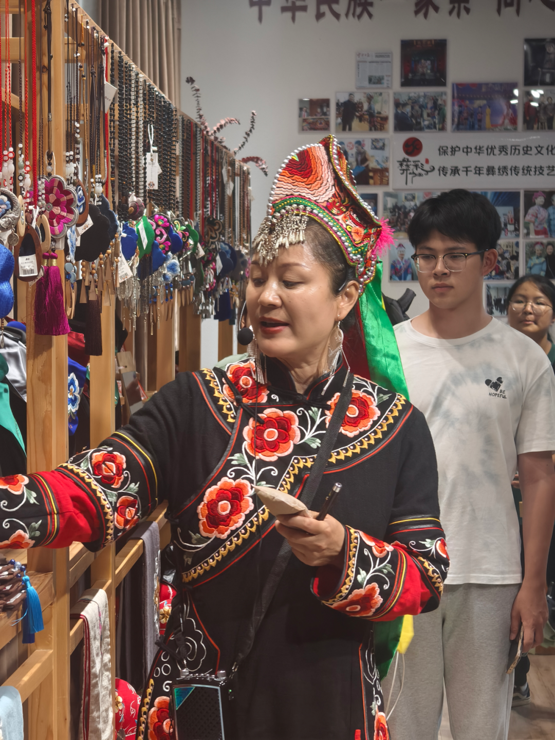 随后,调研团来到云南彝彩文化创意产业开发有限公司。公司负责人张丽琼女士向调研团介绍了公司的发展历程,并带领调研团参观了自己所收藏的彝族服饰,展示并介绍了来自历史各时期、彝族各支系的服饰特色。张丽琼特别提及彝绣产业发展与沪滇协作的紧密联系。近些年,慰问调研,疏通渠道,带动妇女增收。自对口帮扶政策推出以来,上海政府多次组织团队来到云南对各项产业开展调研和慰问,疏通并拓宽了彝绣产业的市场渠道,带动了当地妇女的就业增收,为地区发展和乡村振兴注入了新的活力。