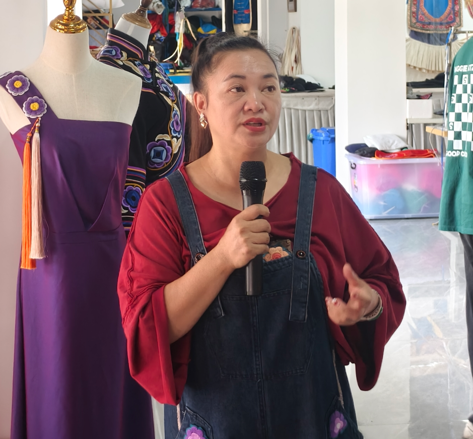之后,调研团又来到卢洁莹首席技能大师工作室。卢洁莹老师以其对彝绣的深厚造诣和前瞻性的设计理念,向调研团展示了她的创新作品。她强调,民族的东西应当做减法,以契合日常化的穿着需求,让彝族文化更好地走出去。这一理念也为彝绣产品的对外推广和创新发展指引了崭新方向。