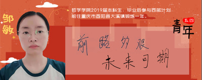 “青年”...该是什么模样?是为祖国、为民族、为人民、为人类奋斗的模样,是敢为人先、敢于突破、新时代弄潮儿的模样,是不负青春、不负韶华、脚踏实地学习的模样?在这个五四青年节,5位哲学学院的毕业生们也发来了寄语,与哲院青年们分享自己的基层工作经历中所感所想,展现他们的“模样”。