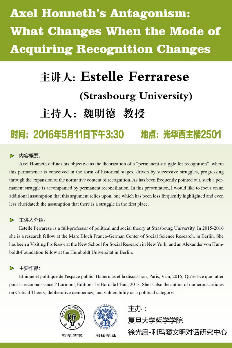 英文学术讲座:Axel Honneth’s Antagonism: What Changes When the Mode of Acquiring Recognition Changes