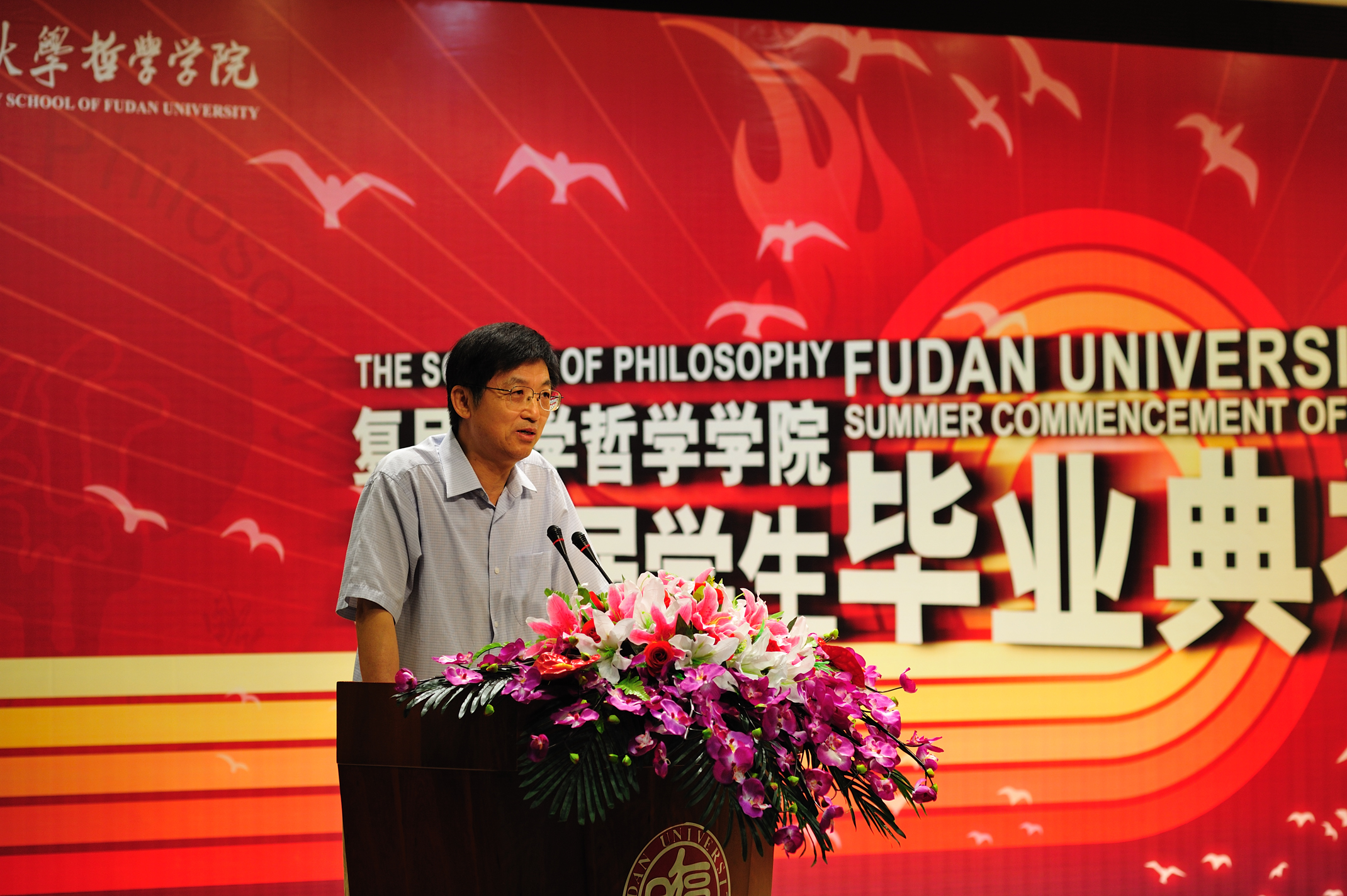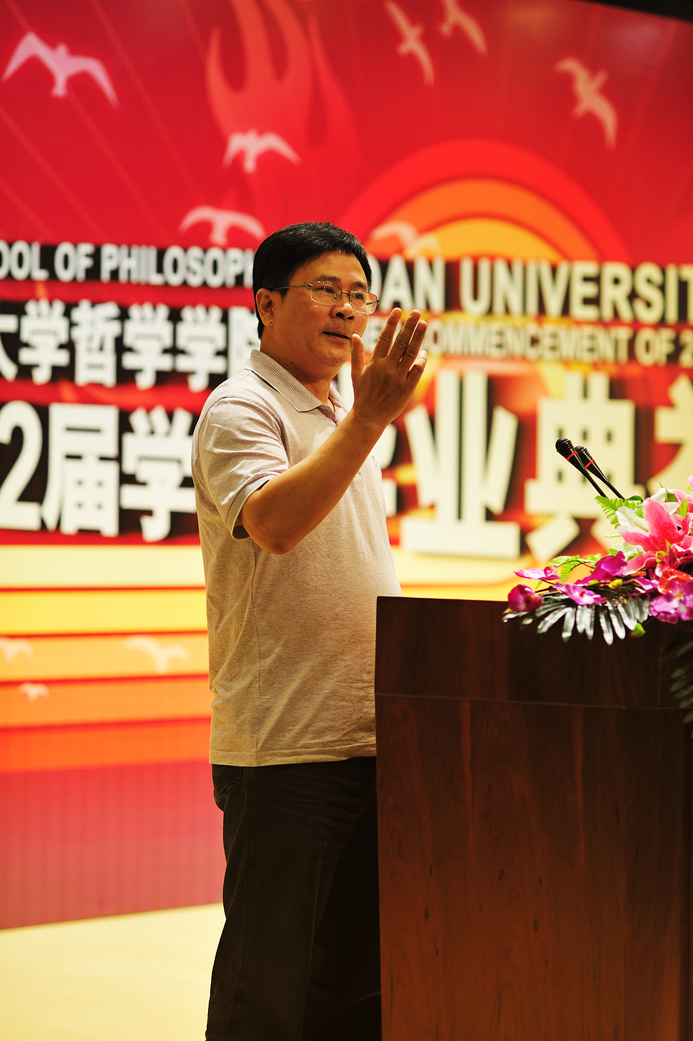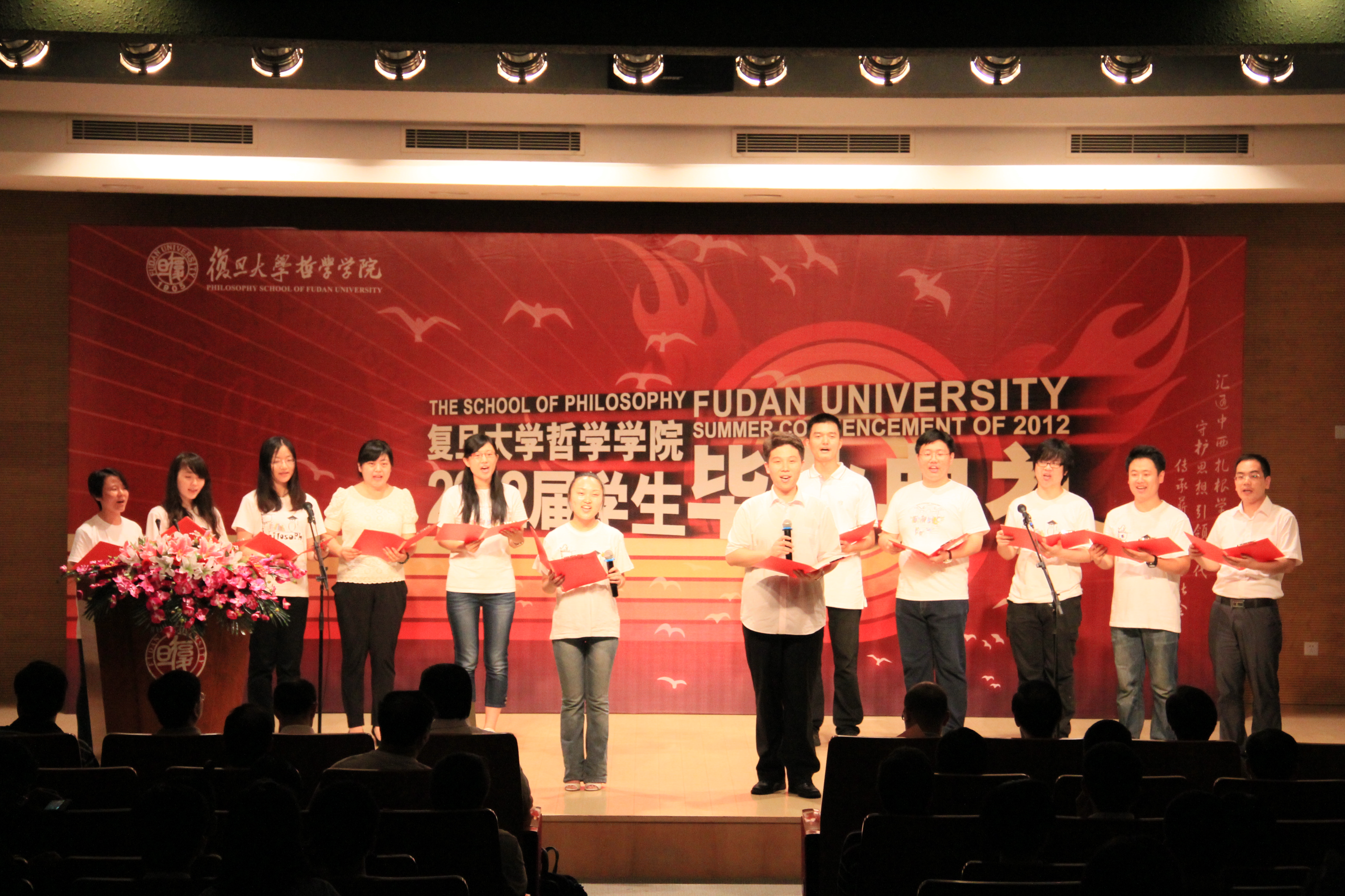 一开始的拉歌环节就让在场的所有哲院人融入到毕业生的热情之中,在抒情的毕业生诗朗诵中,典礼隆重开幕!首先由孙向晨院长致辞,寄语毕业生在今后的人生道路上继续“哲学地生活”,拥有美好灿烂的前程。接下来王新生副院长和郑召利副院长宣读了全体2012届哲学学院毕业生名单。本科毕业生李雅芝、硕士毕业生傅锡洪和博士毕业生陈晓曦代表同学们抒发了毕业感言,回顾了他们在哲院、在复旦走过的道路并向学院致谢。李雅芝的一句“在那份追求自由的勇气下充实而欢乐地流淌”暨代表了学子们对复旦、对哲院精神的领会,也代表即将奔赴前程的他们对未来的期许。教师代表张志林老师和本科生导师代表庄国雄老师为毕业生送上美好祝愿。老师们用幽默而智慧的话语,表达了对学子“特别”的祝愿,相信虽然校园生活已经结束,但哲学的思考与老师们的关怀将长久地“与学生们同在”。
