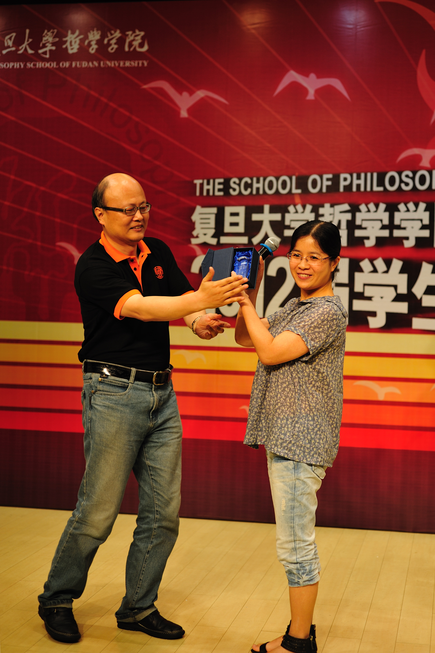 学院胡华忠书记宣读了2012届上海市优秀毕业生、复旦大学优秀毕业生和哲学学院第四届院长奖获得名单。本次院长奖评选突出了学术和实践,本科、硕士和博士毕业班共有五名同学获奖。在孙向晨院长为获奖学生颁发院长奖证书后,黄颂杰、陈学明、孙承叔、朱宝荣、张庆熊老师一起为何朝安、王春明、田文娟、黄俊珺、张波5位院长奖得主颁发了证书和精美礼品。