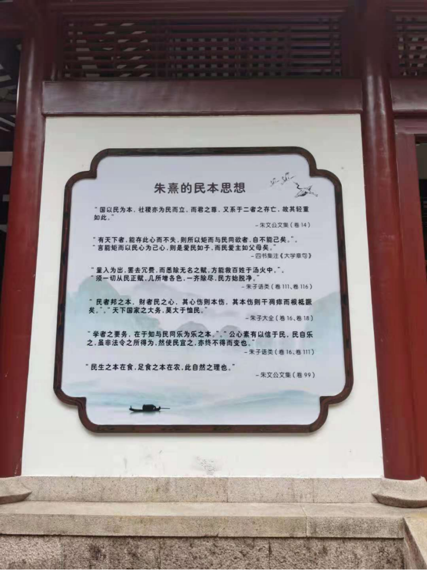 实践团跟随习近平总书记的足迹,来到朱熹园,重温习近平总书记文化自信重要论述,探寻中国共产党人民立场的历史文化根源。中哲学科的实践团成员自告奋勇地担负起朱熹生平和主要学说的现场讲解任务朱熹是宋代著名理学家,他集孔孟以来儒学之大成,创立了朱子理学。朱熹对我国古代民本思想做了理论性的阐释和发展,提出了“王道以得民心为本”“平易近民,为政之本”,并提出“爱民如子”“取信于民”“与民同乐”“富民为本”等具体重民主张,对我国民主思想的启蒙与发展产生过积极的影响。习近平总书记曾在十九届中央政治局第六次集体学习时的讲话引用朱子名言“国以民为本,社稷亦为民而立”,强调加强党的政治建设,要紧扣民心这个最大的政治,把赢得民心民意、汇集民智民力作为重要着力点。